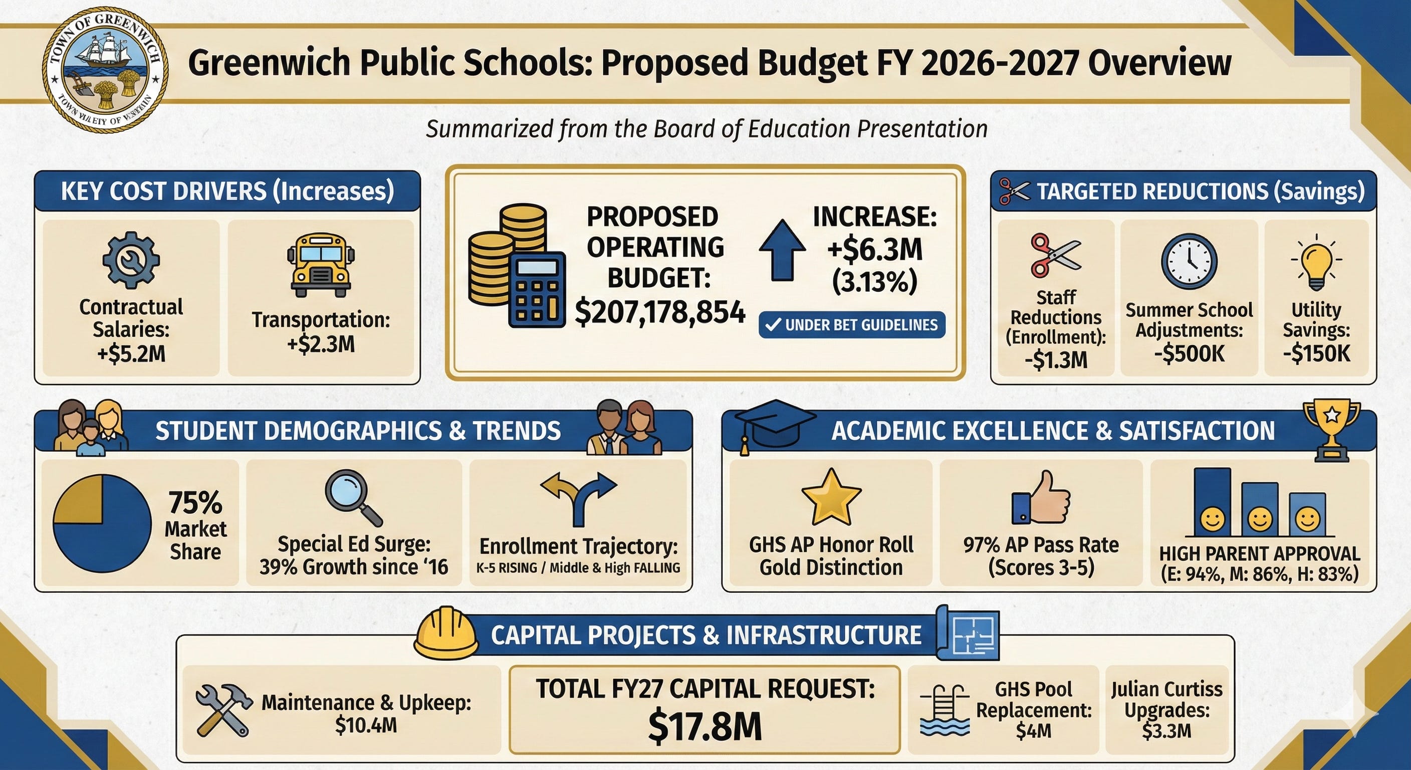The district is also requesting a $17.8M capital budget to address infrastructure needs, including maintenance, the Greenwich High School pool replacement, and upgrades at Julian Curtiss.