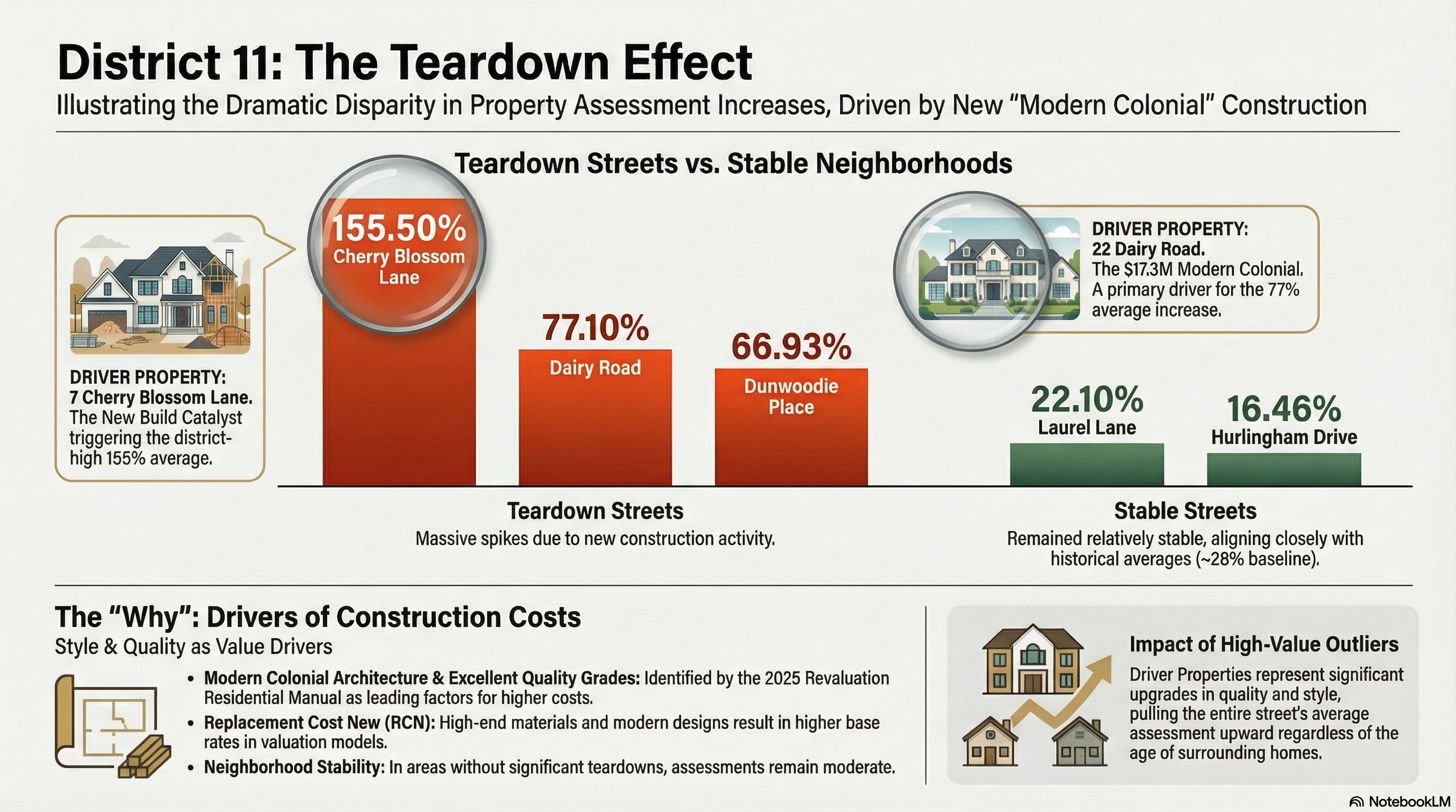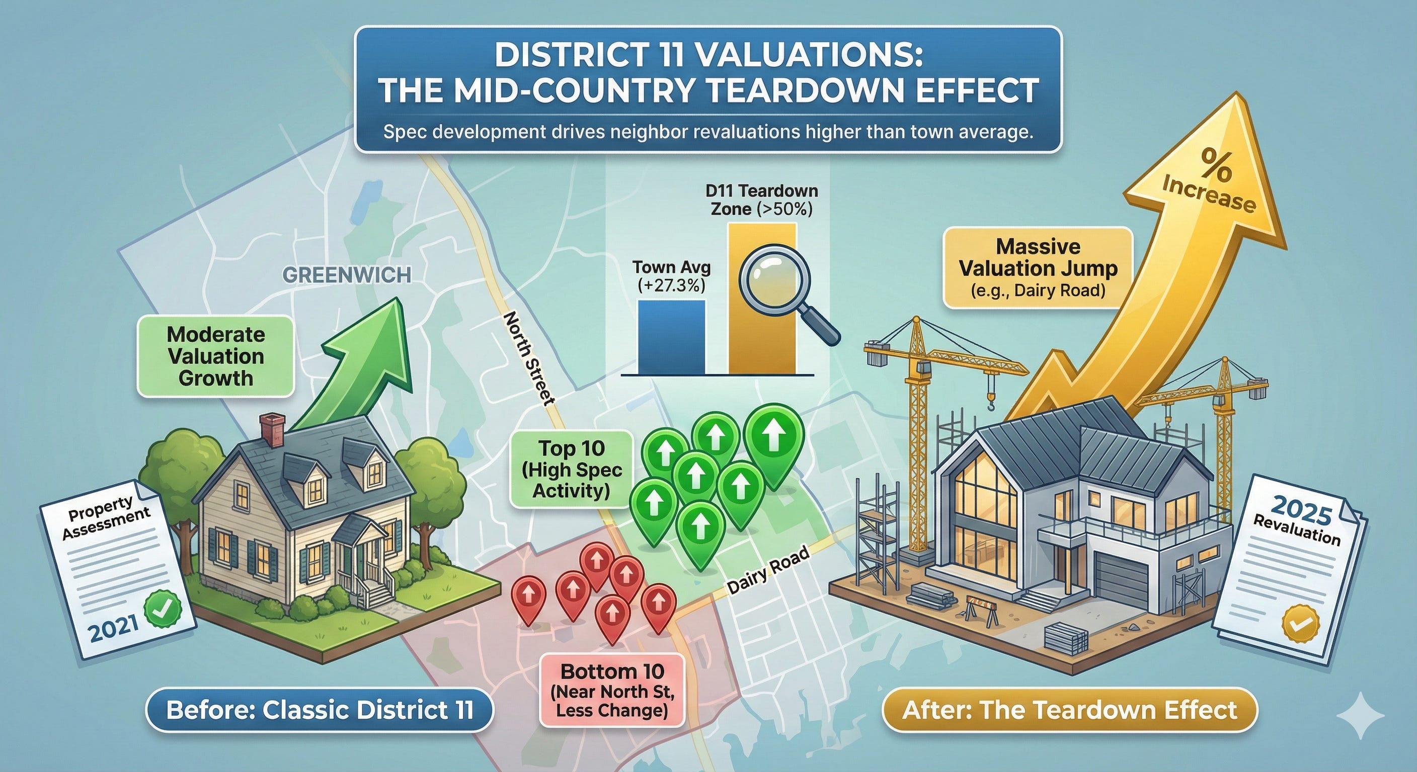 Spec development is back on certain District 11 streets with massive effect. The impact dragged many D11 neighbors' revaluations higher than the town average