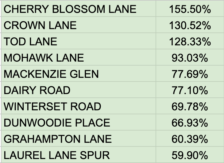 Top ten District 11 streets by valuation increase: