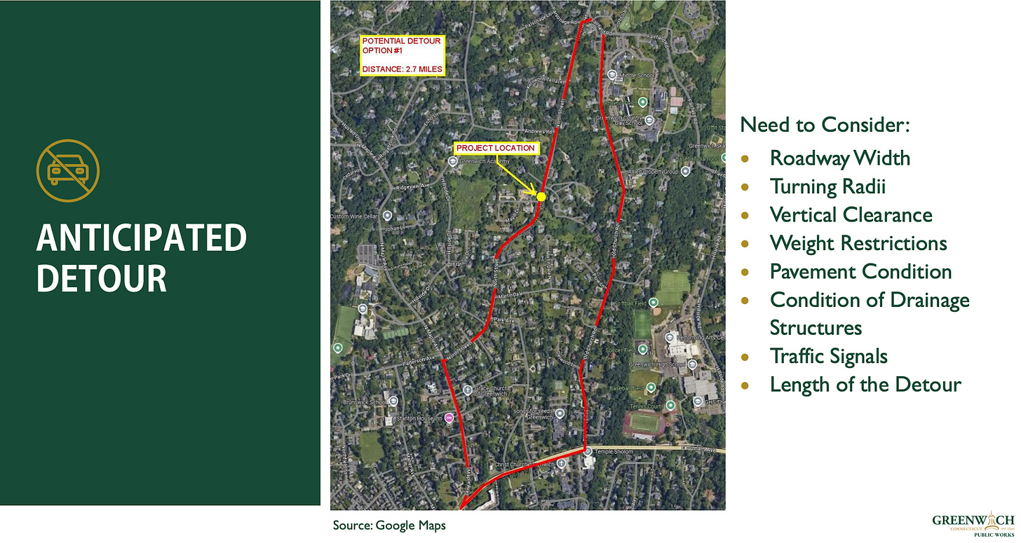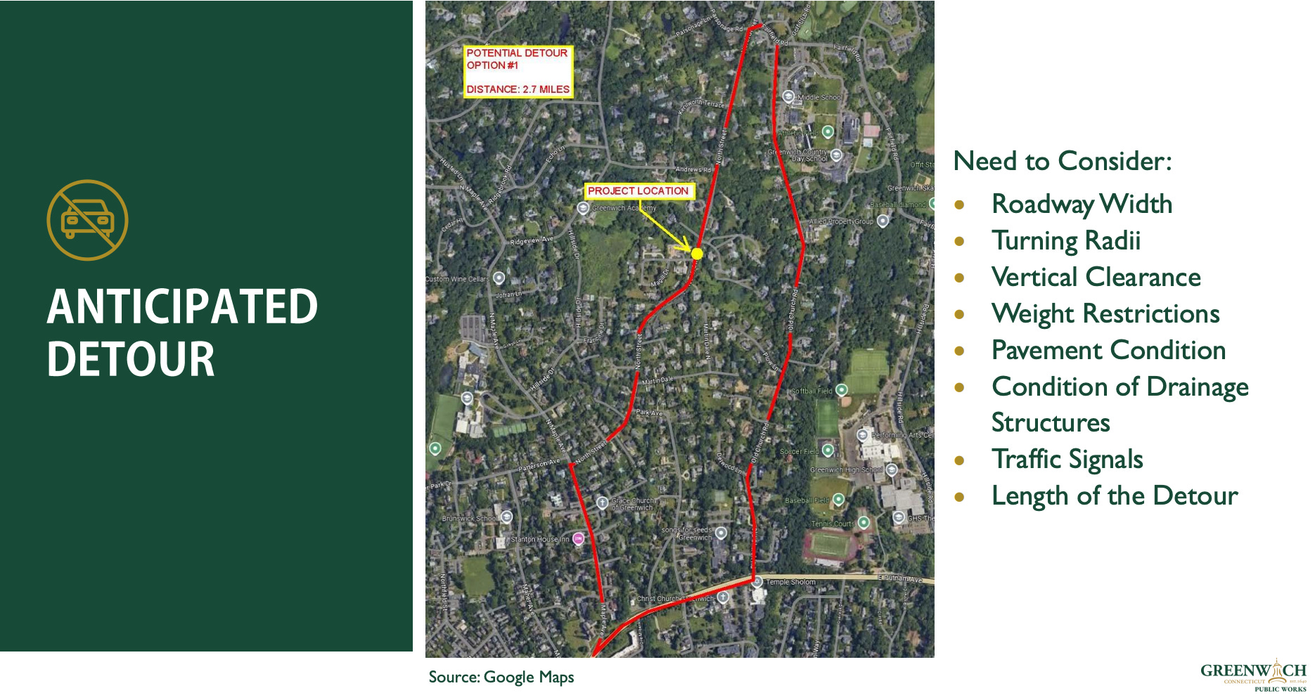 There is an official detour. The Town has had it approved by the Connecticut Department of Transportation since early 2025, and it’s designed to accommodate all vehicles including large trucks and emergency responders.